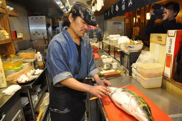 주세왕 대표가 커다란 방어를 칼로 경쾌하게 뜨고 있다.일식 요리사 중에 칼 좀 쓴다는 사람을 찾았다. 그러자 칼에 욕심이 많기로는 서면에서 이자카야 '텟페이'를 하는 주세왕(46) 대표가 일등이라고 여럿이서 말했다.