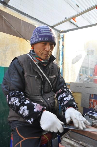 홍순칠 씨에게 칼 수선을 맡기기 위해 일부러 멀리서도 손님이 찾아온단다.자갈치 신동아시장 앞에 '자갈치 칼 명품점'이라고 써 붙인 소형트럭이 보였다. 트럭 뒤편 비닐로 바람만 막은 장소가 작업장이다. 흰 장갑에 꽃무늬 토시 차림. 38년째 '칼 갈이 인생'의 홍순칠(70) 씨이다. 장사가 안 될 줄 알았는데 뜻밖으로 단골이 많아 일은 많단다.