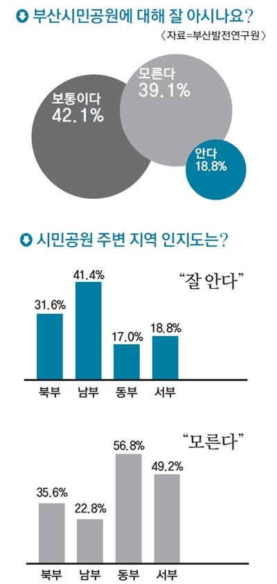 또한 부산시민공원을 중심으로 남부, 북부, 서부, 동부 지역으로 나눠 해당 지역의 인지 정도를 살펴봤을 때 동부의 경우 '모른다'는 응답이 56.8%로 나타났고 남부의 경우만 '안다'가 41.4%로 '모른다'(22.8%)보다 더 많았다. 동부 지역은 송상현 광장, 하마정 사거리 쪽이며 남부 지역은 서면 교차로 인근이다.