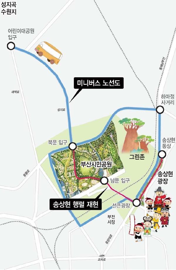 보고서는 두 '섬'을 연결하고 부산시민공원이 제 역할을 하게 하기 위한 방안으로 13가지 기본구상을 제시했는데 그중 △동래부사 송상현 행렬 재현 △시민공원 주위 1.5㎞ 그린존 조성 △아트마켓 스트리트 조성 △미니버스 운행 등 4가지는 최우선으로 추진해야 할 사업으로 제시했다.