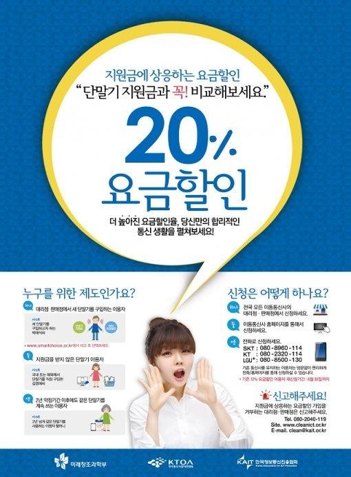 사진은 미래창조과학부.24일부터 지원금에 상응하는 휴대전화 요금할인이 기존 12%에서 20%로 상향 조정된다. 단말기에 대한 보조금 최대 33만원을 지원받는 것 대신 다달이 요금할인 20%를 받을 수 있는 것.