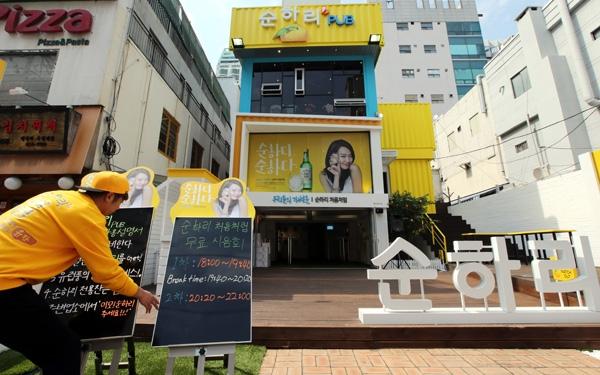 롯데주류에서 출시한 14도짜리 유자맛 소주 '처음처럼 순하리'가 젊은 층을 중심으로 인기를 모으고 있는 가운데 '순하리 펍(Pub)'이 27일 경성대 앞에 오픈했다. 정종회 기자 jjh@'소주계의 허니버터칩.'