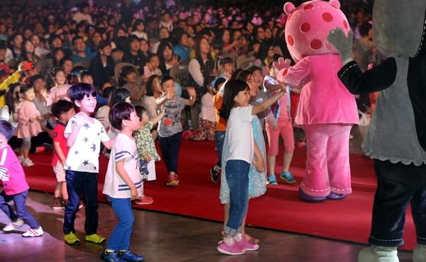 어린이날인 5일 '부산 어린이날 큰 잔치'가 부산 해운대구 벡스코 전시장과 야외광장에서 열렸다. 실내공연행사에 참가한 어린이들이 캐릭터 공연을 보며 즐거워하고 있다. 이재찬 기자 chan@
