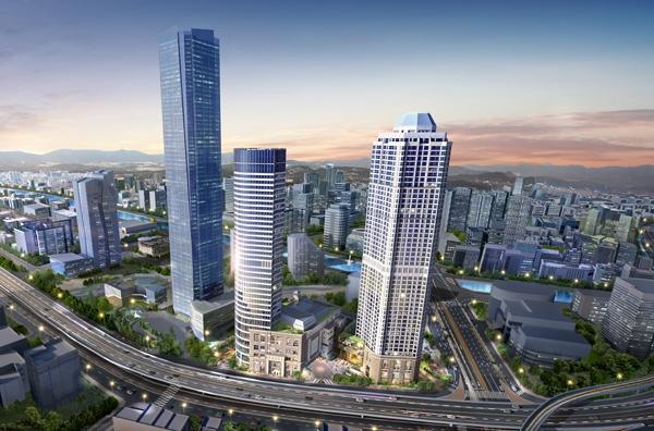 부산의 맨해튼을 꿈꾸는 문현금융단지 투시도. 63층 BIFC 옆에 지상 36~49층 2개 동으로 호텔과 상가, 오피스, 뮤지컬전용극장 등이 들어선다. 유림E&C 제공문현금융단지는 꿈을 꾼다. '부산의 맨해튼'이다. 2009년 1월 21일 해양·파생금융 특화 금융중심지로 지정된 지 꼬박 6년 만이다.
