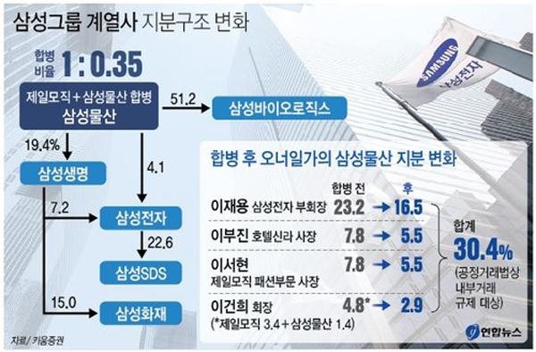 이 부회장은 합병회사(삼성물산)의 최대주주(16.5%)로서 삼성그룹의 핵심 계열사인 삼성전자와 삼성생명에 대한 지배력이 한층 커질 것으로 보인다.