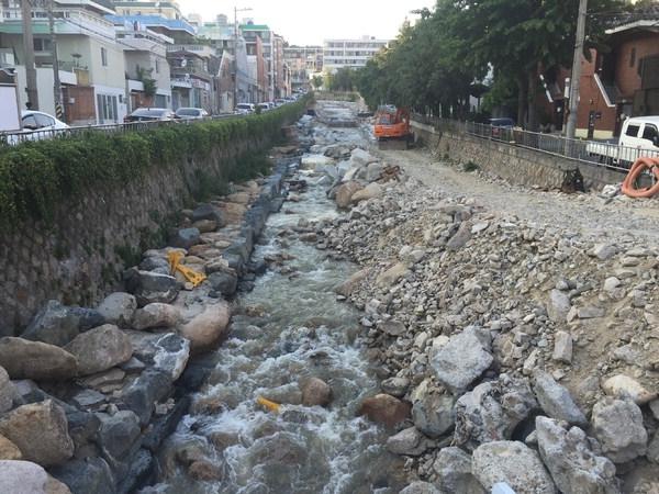지난 4월 부산 금정구 남산동 남산본동교 일대. 지난해 여름 폭우로 수해를 입은 온천천 상류 구간에 복구 공사가 한창이었다. 포클레인은 쉴새 없이 강바닥을 파헤치고, 레미콘 차량이 수시로 드나들었다.