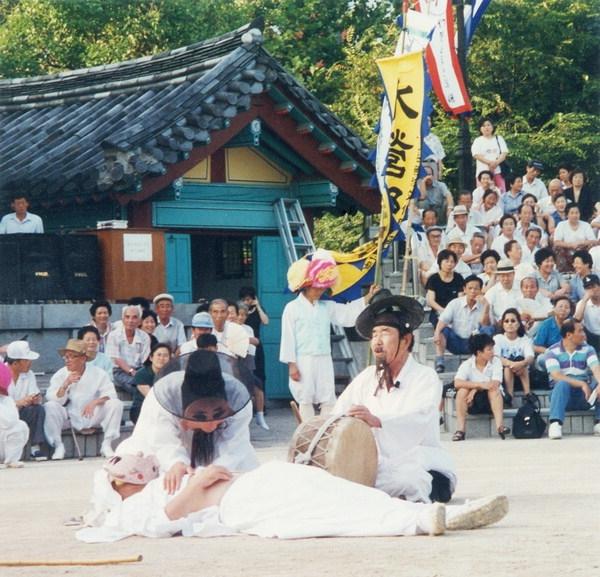 지난 13일 수영동 수영민속놀이마당에서는 수영민속보존회원의 길놀이와 수영야류 탈제를 시작으로, 수영야류의 할미·영감과장이 질펀하게 연희되고 있었다.