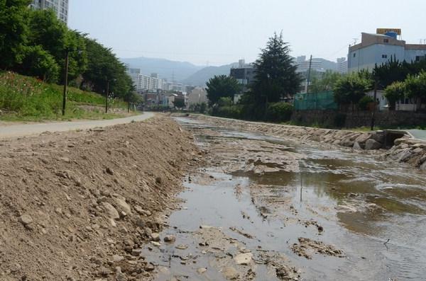 지난 23일 부산 북구 경남아파트 부근 대천천에는 홍수 복원 공사가 진행 중이었다. 북구청은 지난 2월부터 16억 원을 들여 올해 7월까지 대천천 복구공사를 진행하고 있다. 이 덕에 강 주변은 황량하게 흙이 드러나 있었고 햇볕을 피할 그늘 하나 없었다.
