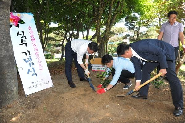 박 구청장과 직원들은 소중한 울산동백을 지난 5월 21일 학성공원(6그루)과 구청 광장(5그루)에 나눠 심어 많은 중구민이 볼 수 있도록 했다. 게다가 올해는 광복 70주년이자, 내년은 울산동백을 일본에 가져간 지 420년이 되는 해(육십갑자가 되는 해)로 그 의미가 남달랐다.