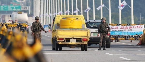 남북이 북한의 서부전선 포격도발에 따른 한반도 긴장 고조 상황을 해소하기 위한 고위급 회담을 재개한 가운데 24일 오전 경기도 파주시 통일대교 남단에서 개성공단 차량이 평소처럼 임진강을 건너고 있다. 연합뉴스한반도의 군사적 충돌 위기를 해소하기 위한 해법을 놓고 남북 고위급 대표단이 판문점에서 지난 22일부터 24일 밤 늦게까지 사흘째 밤샘도 무릅쓰며 '사생결단'의 협상을 벌이고 있다.