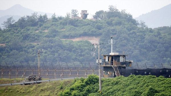 군사적 긴장 상태 해소를 위한 남북 고위급 접촉이 24일로 사흘째 계속되고 있는 가운데 이날 오후 서부전선 전방부대 경계초소 너머로 북한군 초소가 보이고 있다. 연합뉴스한반도의 군사적 긴장 상태를 해결하기 위한 남북 고위급 접촉이 시작된 지 사흘째인 24일 밤늦게까지도 합의를 보지 못한 채 계속되고 있다.