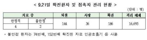 질병관리본부에 따르면 메르스 누적 확진자 총 186명, 퇴원 총 144명, 사망자는 36명이다.