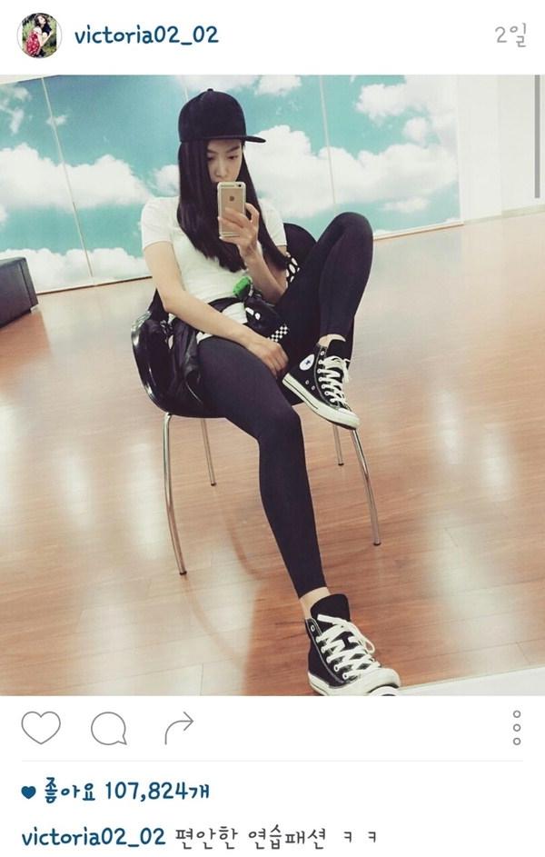 걸그룹 에프엑스의 리더 빅토리아가 지난 20일 자신의 인스타그램을 통해 "편안한 연습패션"이라는 짧은 글과 함께 근황 사진을 개제했다. 사진 속 빅토리아는 화장기 없는 수수한 모습에 스냅백을 눌러 쓰고 편안한 사복 패션을 연출했다. 특히 블랙 컬러의 레깅스를 활용해 슬림한 다리 라인을 드러냈으며, 캔버스화를 신었음에도 남다른 황금 비율 몸매를 뽐내 팬들의 부러움을 샀다.