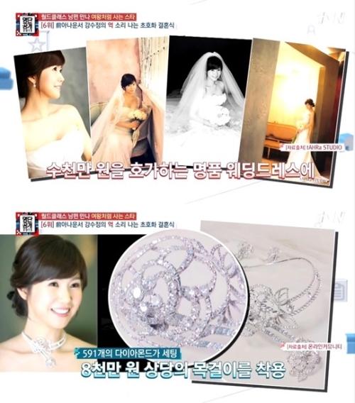 강수정은 매트김과의 결혼식 당시 홍콩의 6성급 호텔에서 비밀리에 예식을 올렸다. 또 수천만원을 호가하는 명품 웨딩드레스에 591개의 다이아몬드가 세팅된 8천만원 상당의 목걸이를 착용했다.