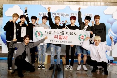 업텐션은 22일 오전 출국전 김포공항에서 '경축, 대륙 누나들 마음도 위험해'라고 적힌 현수막을 들고 기념사진을 찍는 등 신인다운 패기를 보였다.