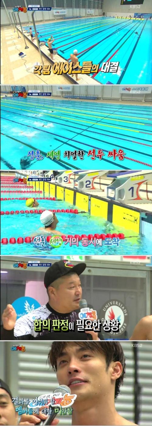 [비에스투데이 김정덕 객원기자] KBS2 '우리동네 예체능'의 수영대축제의 하이라이트인 접영 50m 경기에서 우리동네 수영반 성훈이 김세영, 셔누, 로빈과 손에 땀을 쥐게 하는 경기를 펼쳤다.