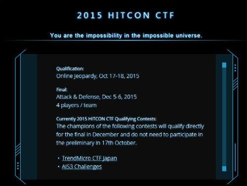 2015 HITCON CTF는 대만 경제발전부(MOEA) 산하 공업국(Industrial Development Bureau, IDB) 지원으로 대회 규모가 더욱 커지고 풍성하게 진행된다. 이전 대회는 예선 및 결선 모두가 온라인에서 경쟁이 이뤄졌지만 올해는 최초로 대만 현지에서 결선이 열리게 된다.