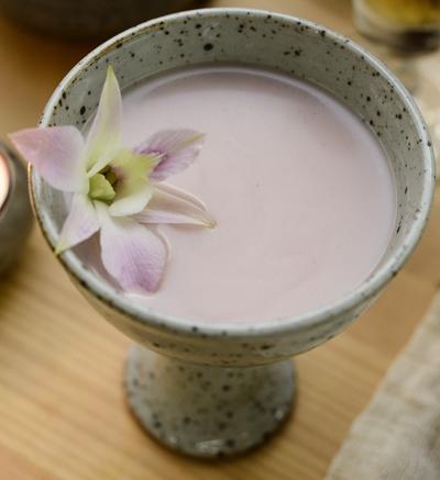 ▲재료=밀 막걸리 3잔(90㎖), 오미자 2/3잔(20㎖), 사이다 1잔(30㎖), 얼음 ▲만드는 법=①칵테일 잔에 얼음을 조금 넣는다 ②막걸리, 오미자, 사이다 순으로 넣고 작은 스푼으로 휘저어 낸다 ▲특징=오미자의 다섯 가지 맛과 막걸리가 만나 핑크빛 분위기의 칵테일이 된다. 화채와 비슷한 느낌이 나며 꽃잎으로 마무리하면 사랑스럽게 변신한다.
