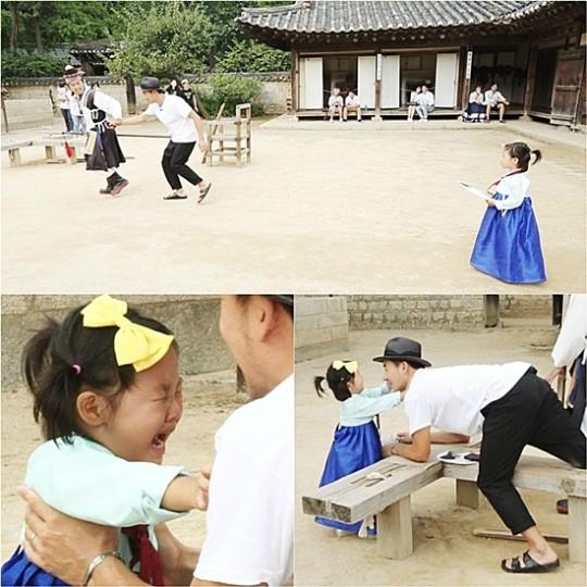 '슈퍼맨이 돌아왔다' 한국 민속촌을 찾은 엄지온이 포도청 사또 앞에서 폭풍 오열하는 모습이 포착됐다.