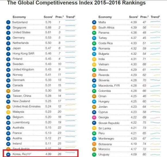 [비에스투데이 류세나 기자] 세계경제포럼(WEF)이 해마다 발표하는 국가경쟁력 순위 평가에서 우리나라가 2년 째 26위를 기록했다. 10년 만에 최저치로 떨어졌던 지난해와 같은 순위다.