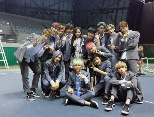 사진 속 조수향은 수수한 미소를 지으며 최고라고 말하듯 엄지를 들고 있으며, 세븐틴은 각각의 다양한 표정과 포즈를 취하며 카메라를 바라보고 있다.
