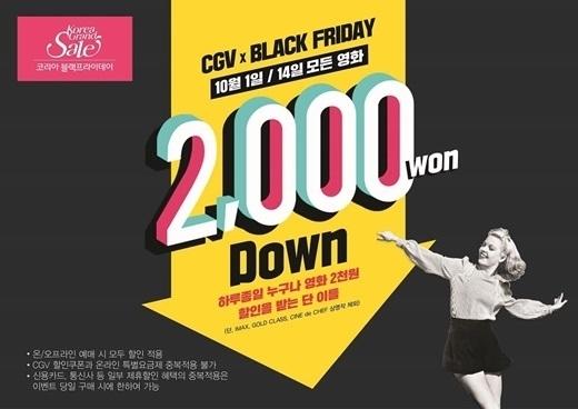 CGV 측은 1일 "코리아 블랙프라이데이를 맞아 시작일인 1일과 마지막날인 14일 이틀 동안 전국 CGV에서 2천원 영화할인 혜택을 제공한다"고 밝혔다.