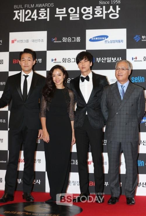 [부산=비에스투데이 강민지 기자] 배우 박성웅(왼쪽부터) 전도연 김남길 이경영이 2일 오후 부산 해운대구 그랜드호텔에서 열린 '부일영화상' 시상식에 참석했다.
