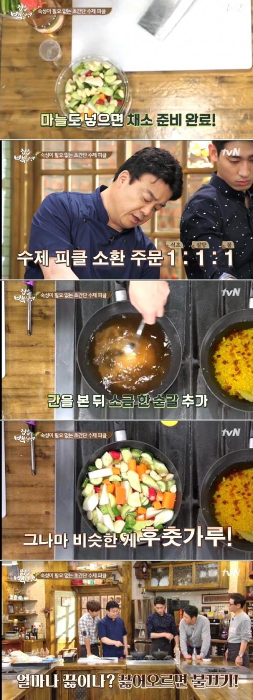 백종원은 "원래는 피클을 만드는데 여러 향신료가 필요하지만 집에 그런 것이 있을리가 없으니 간단하게 통후추와 계피가루를 살짝 넣으면 된다"고 밝혔다.