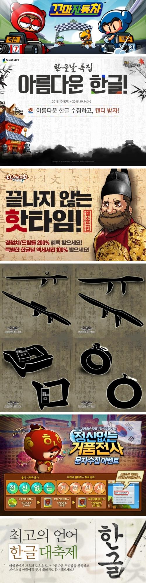 넥슨 공식 페이스북 페이지에서는 한글날 당일(9일) '한글날 기념 넥슨엽전 증정 놀이' 이벤트를 진행한다. 특정 게임용어를 한글로 순화해 유머 있게 댓글을 단 유저 10명을 선정해 넥슨 캐시 3만원을 지급한다.