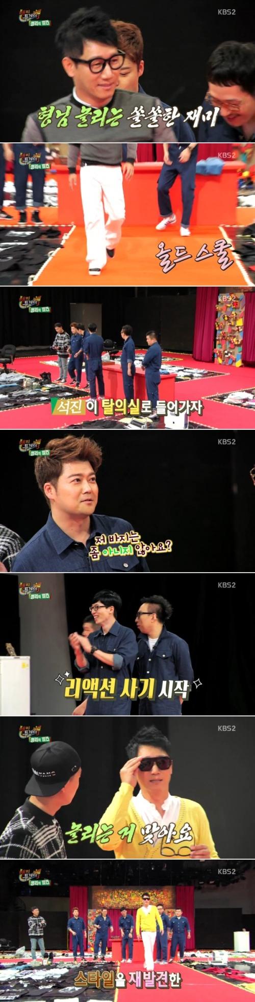이날 지석진은 자신의 옷 중 입기 민망했던 것으로 90년대 초반 스타일의 바지를 선보였다. 하지만 MC들은 괜찮은 스타일로 보인다며 입어보라고 권했다.