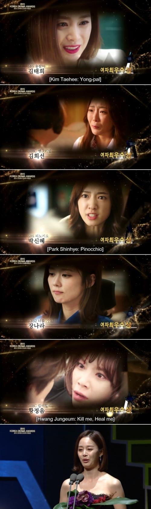 이날 여자 최우수 연기상 후보로는 SBS '용팔이' 김태희, MBC '앵그리맘' 김희선, SBS '피노키오' 박신혜, KBS2 '너를 기억해' 장나라, MBC '킬미힐미' 황정음이 후보로 올랐다.