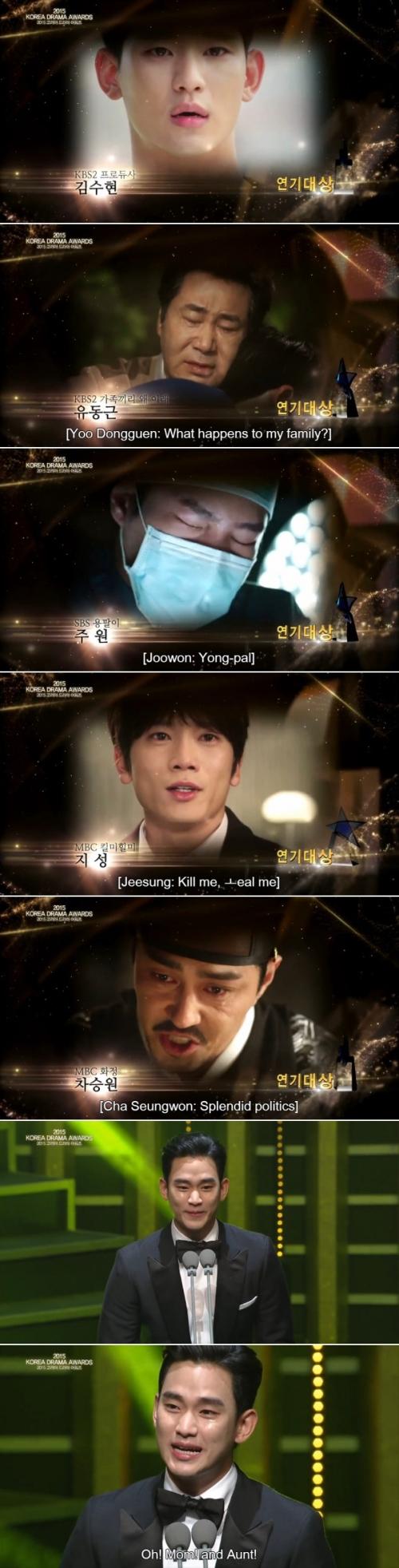 9일 오후 경남 진주시 경남문화예술회관에서 열린 2015 코리아 드라마 어워즈(KDA)에서 KBS2 '프로듀사'의 김수현이 연기 대상을 수상했다.