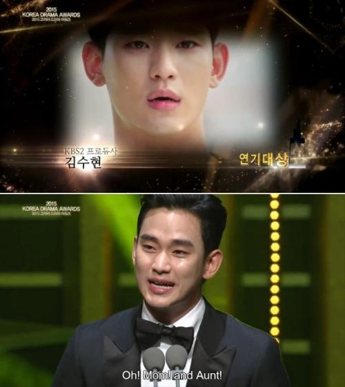 이날 대상의 영광은 KBS2 '프로듀사'의 김수현에게 돌아갔다. 이는 2014년 SBS '별에서 온 그대' 수상에 이은 2년 연속 대상 수상.