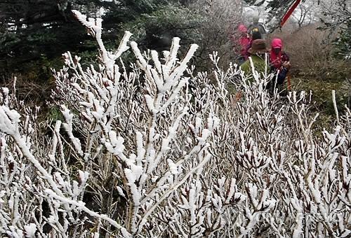 강원지방기상청은 설악산 중청봉의 아침 기온이 영하로 떨어지면서 이날 오전 7시께부터 산발적으로 눈이 날렸다고 밝혔다.