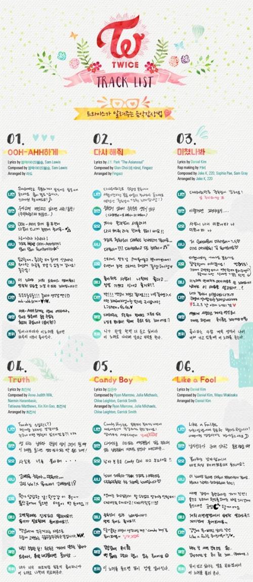 이날 공개된 트랙리스트 이미지에는 트와이스가 자필로 쓴 각 노래별 음악 감상법도 담겼다.