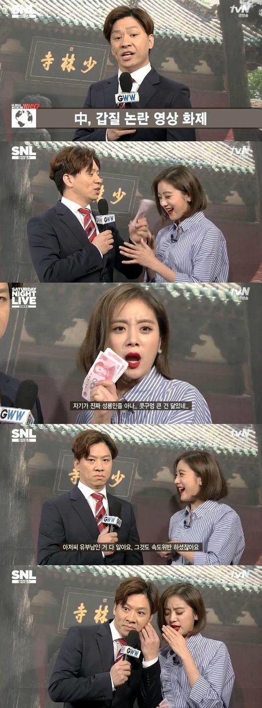 10일 오후 방송된 케이블채널 tvN 'SNL 코리아 시즌6‘에서는 그룹 원더걸스가 호스트로 출연한 가운데 '글로벌 위켄드 와이' 코너에서 중국 특파원 양꼬치엔 칭따오로 분한 정상훈의 모습이 그려졌다.