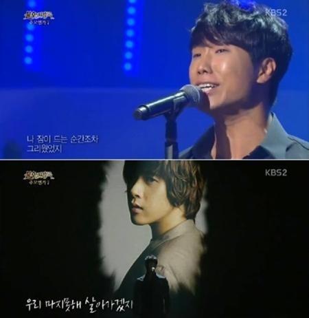 사진은 KBS2 '불후의 명곡' 방송화면 캡처.SG워너비의 김진호가 jtbc '히든싱어 시즌4'에서 원조가수로 출연해 팬들과 함께 감동의 무대를 선사했다. 그는 여러 방송에서 SG워너비의 초창기 멤버였던 고 채동하를 떠올리며 그의 죽음을 애달퍼 했다.