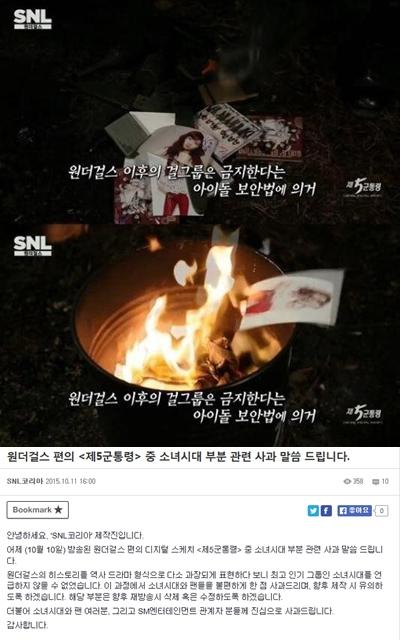 11일 'SNL코리아' 측은 공식 홈페이지를 통해 "10일 방송된 원더걸스 편의 디지털 스케치 '제5군통령' 중 소녀시대 부분과 관련해 사과 말씀을 드린다"고 전했다.
