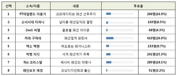 설문조사에서는 남다른 패션 감각으로 워너비 패션을 보여준 f(x)의 크리스탈이 18.07%(285명)로 2위, 크리에이티브 패션의 선두주자인 FT아일랜드 이홍기가 16.87%(266명)로 3위를 차지했다. 세계 패션계가 주목하는 빅뱅 GD, 인기그룹 엑소의 떠오르는 패셔니스타 백현, 소녀시대 티파니, 2ne1 씨엘, 레인보우 재경이 뒤를 이었다.