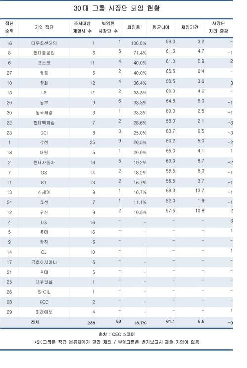 퇴임 사장단의 평균 나이는 61.1세로, 55.6세에 사장단에 들어가 5.5년을 재임한 것으로 조사됐다.