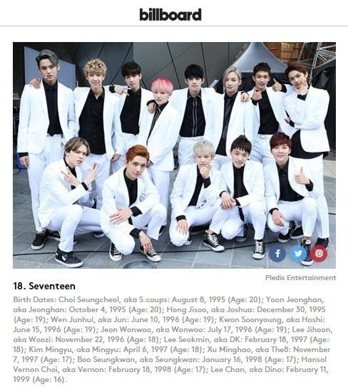 세븐틴 빌보드 21 Under 21 선정, 아시아 가수로 유일하게 이름 올렸다