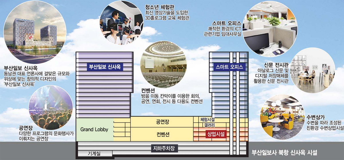 북항 신사옥은 과거 정보를 전달하는 매체로서의 신문사 기능에서 한걸음 나아가 IT기술과 문화공간을 기반으로 문화·전시·상업 업무가 융합된 언론의 새로운 패러다임을 제시한다.