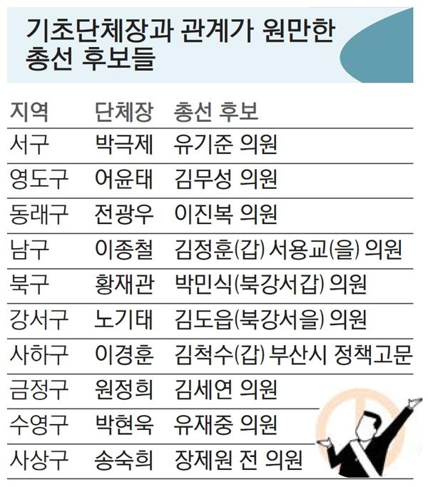 현재 부산에서 단체장과의 관계가 원만한 총선 후보들은 당내 경쟁률이 현저히 낮다. 김무성(영도) 유재중(수영) 김세연(금정) 박민식(북강서갑) 김정훈(남구갑) 서용교(남구을) 의원과 김척수(사하갑) 부산시 정책고문, 장제원(사상) 전 의원이 바로 그들이다. 이들은 단체장과의 관계가 돈독하다. 이들중 유재중·김세연·박민식 의원은 새누리당 내부 경쟁자가 한명도 없다. 김무성·김정훈·서용교 의원과 김척수 고문, 장제원 전 의원은 각각 1명씩 당내 경쟁자가 있다. 유기준(서구) 이진복(동래) 의원도 당내 경쟁자가 적은 편이다.