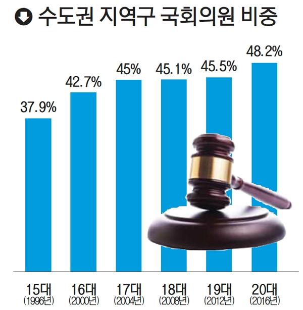20대 국회에서 수도권 지역구 국회의원 의석수가 전체 지역구 의석의 절반에 육박하면서 '입법' 권력마저 수도권에 넘어가게 된 것이다.