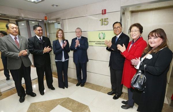 23일 오후 부산 부산진구 소재 삼비빌딩 15층에서 열린 주부산과테말라명예영사관 개소식에서 구스타보 로페즈 주한 과테말라 대사와 임수복 주부산과테말라 명예영사 등이 현판 앞에서 기념촬영을 하고 있다. 강선배 기자