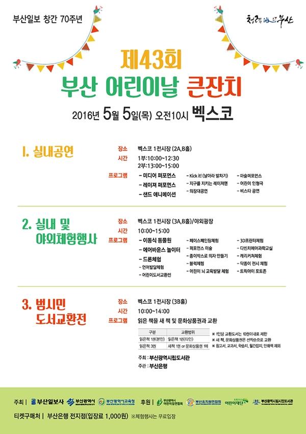 5일 오전 10시부터 해운대 벡스코에서 개최되는 '어린이날 큰잔치'는 올해로 벌써 43회째를 맞이했다. 마술쇼, 레이져쇼를 포함한 실내공연과, 에어바운스 놀이터, 드론체험, 3D프린터 체험 등을 할 수 있는 야외체험행사로 나뉜다. 또 읽은 책을 새 책 및 문화상품권과 교환해주는 '범시민 도서교환전'도 함께 열린다. 실내공연의 경우는 입장료(1천원)을 내고 부산은행 전 지점에서 티켓을 구매해야 한다. 입장료 전액은 어려운 아이들을 위해 쓰인다.