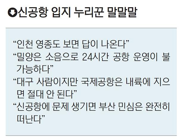 '지역 이기주의'를 꼬집는 의견도 많았다. 'jhon****'라는 아이디를 쓰는 누리꾼은 "애초에 부산 도시기본계획에서 출발해서 포화상태인 김해공항의 대체재로 수립된 부산 신공항 계획이 어찌하다 '영남권 신공항'이라는 이름으로 둔갑하게 되었냐"며 "자기 동네에 있는 공항은 쓰지도 않으면서 투기 욕심으로 몽니 부리는 대구 때문에 이 난리가 벌어진 것"이라고 주장했다.
