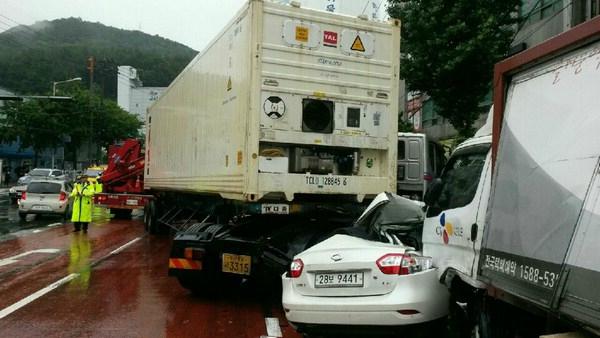 사하구 구평동 5중 충돌 사고 현장. 부산경찰청 제공폭우 탓에 교통사고가 잇따라 발생해 2명이 사망했다.