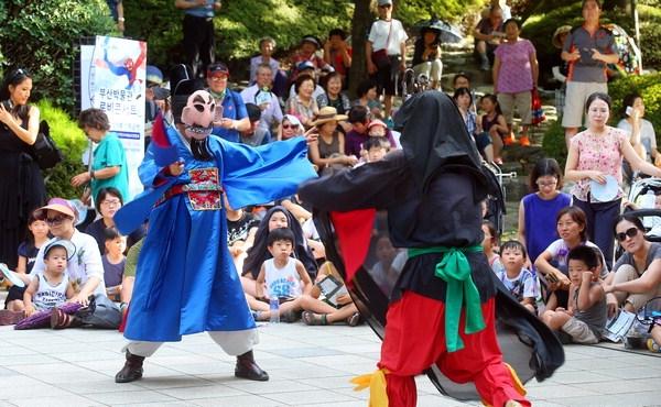 '부산박물관 로비콘서트-수영야류 기획공연'이 27일 오후 박물관 야외마당에서 열려 무더위 속에 박물관을 찾은 많은 시민들이 공연을 관람하고 있다. 수영야류는 1971년 국가무형문화재 제43호로 지정돼 전승·보존되고 있다. 정종회 기자 jjh@