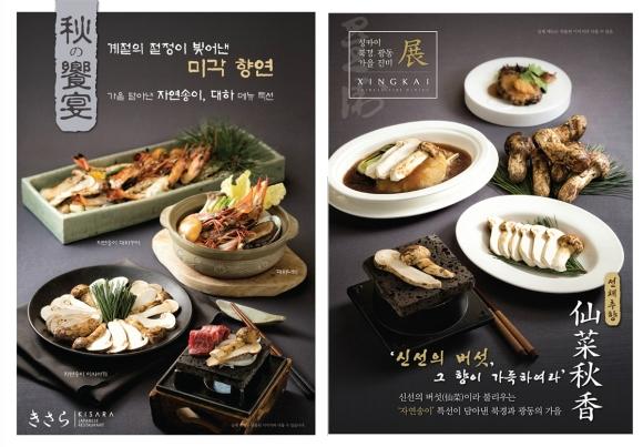 일식 레스토랑 '키사라'는 제철 자연송이에 대하를 곁들인 '가을향연'을 선보인다. 돌판을 이용해 자연송이를 바로 구워 먹는 '자연송이 이시야끼', 자연산 대하를 곁들인 '대하 나베'와 '자연송이 대하구이'로 구성됐다. 각 메뉴 가격은 3만원~7만5천원 선이다.